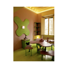Tutta sul tema del non angolo perché nell’angolo si racchiudono le nostre paure, la nostra parte razionale mentre nelle forme tondeggianti si esprime il nostro mondo del sentire (la stessa natura ce lo insegna)