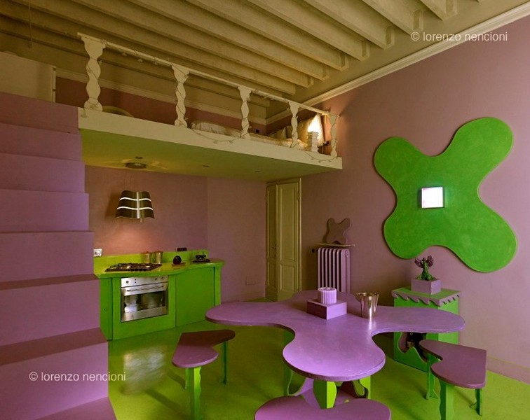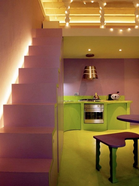 In questa stanza, luogo di ritrovo comune per la famiglia ho voluto dare due colori complementari e forti: lilla e verde.
