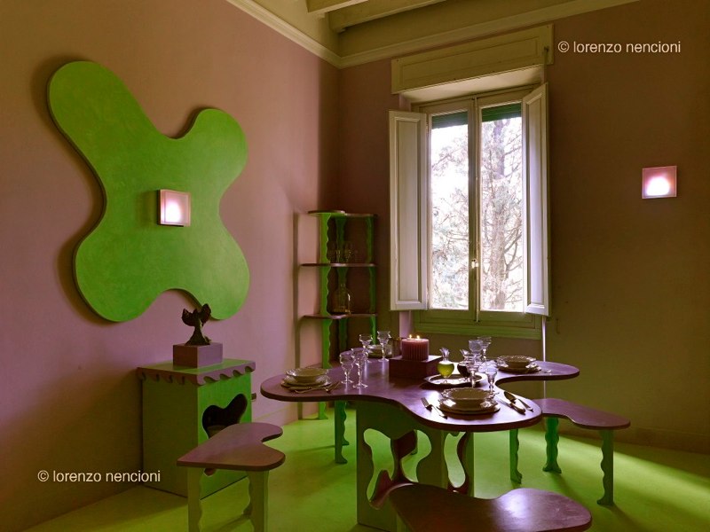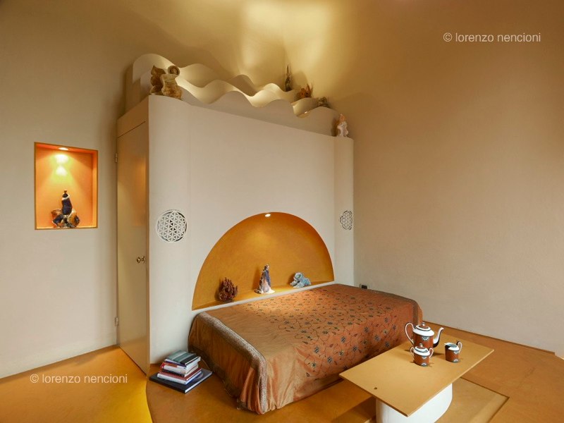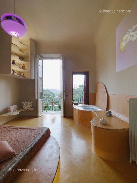 All’interno della casa /scultura, la mia camera è ispirata ai 4 elementi fondamentali :fuoco, acqua, aria e terra che si ritrovano sia in sculture che come elementi di arredo: in terra, la terra colorata, il mio Fuoco /scultura e la vasca che è anch’essa una scultura.